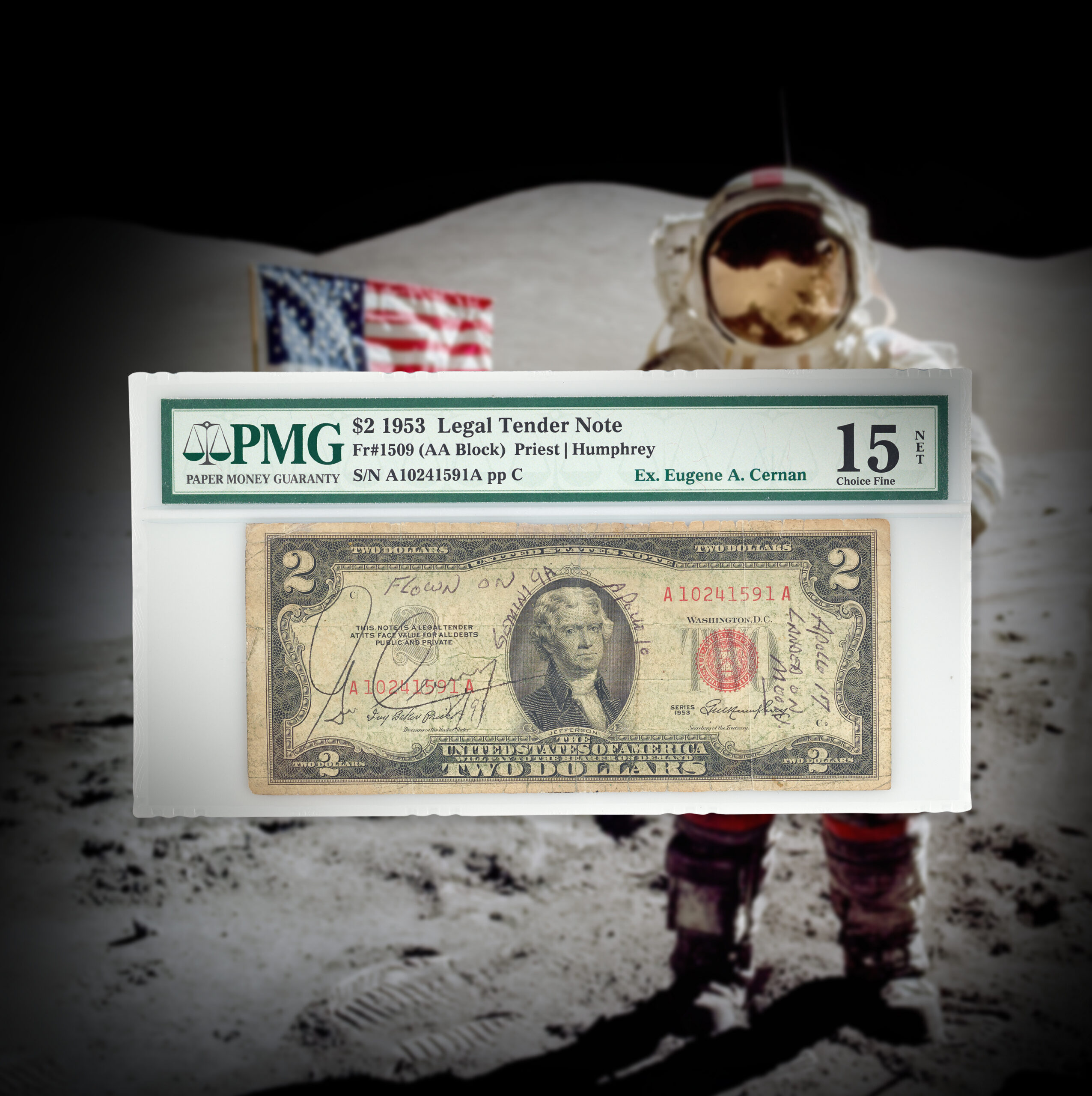 Gene Cernan’s three-time flown $2 bill—carried into Earth orbit on Gemini 9A, into lunar orbit on Apollo 10, and then all the way to the surface of the Moon on Apollo 17—sits alone at the summit of this rarest category.